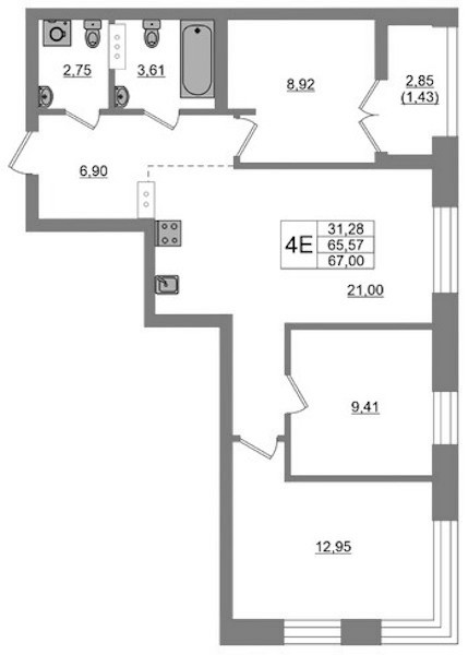 Трёхкомнатная квартира на 7-ом этаже 67 кв.м