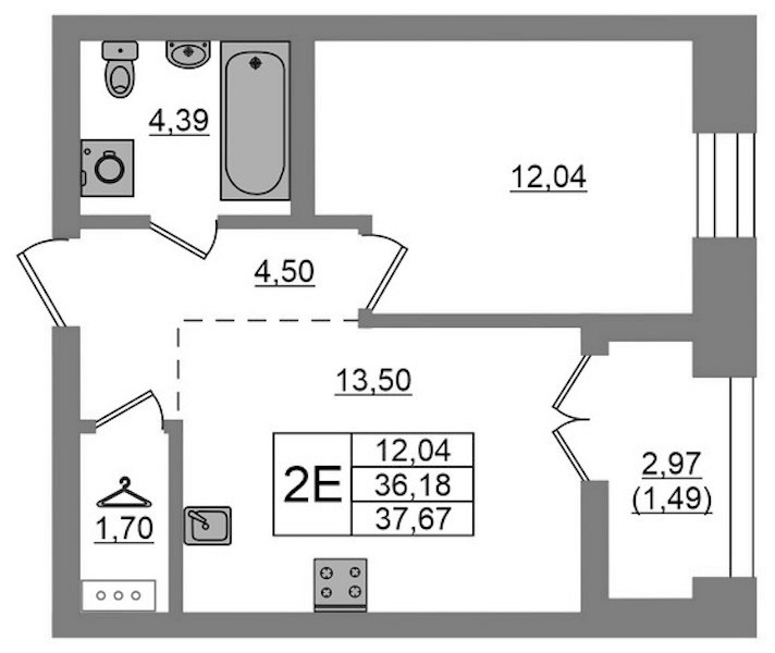 Однокомнатная квартира на 7-ом этаже 37,67 кв.м