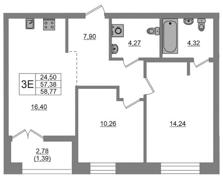 Двухкомнатная квартира на 2-ом этаже 58,77 кв.м