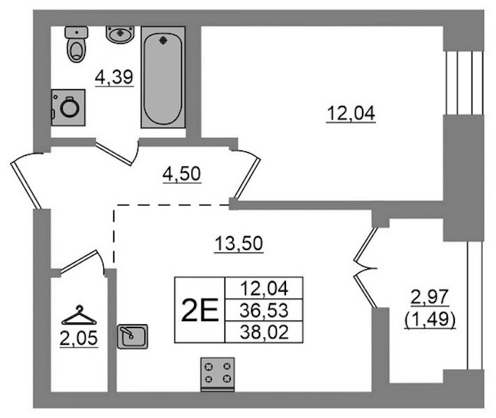 Однокомнатная квартира на 2-ом этаже 38,02 кв.м