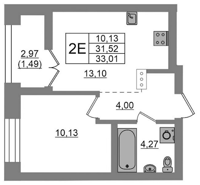 Однокомнатная квартира на 2-ом этаже 33,01 кв.м