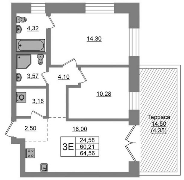 Двухкомнатная квартира на 2-ом этаже 64,56 кв.м