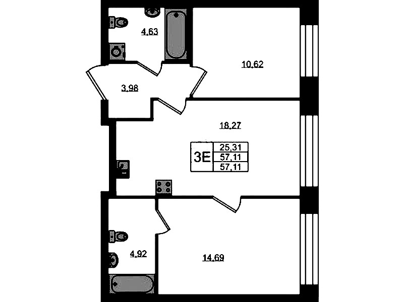 Двухкомнатная квартира на 2-ом этаже 57,11 кв.м