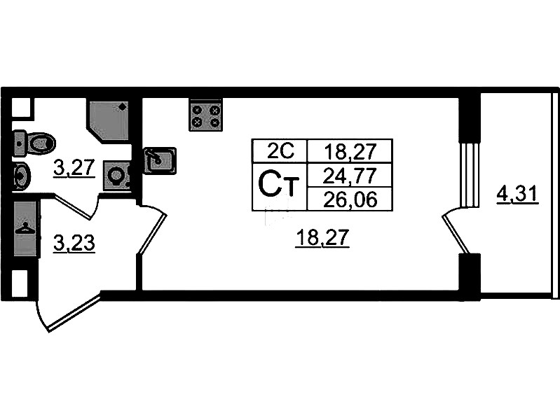 Квартира-студия на 3-ем этаже 24,77 кв.м