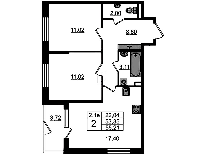 Двухкомнатная квартира на 1-ом этаже 53,35 кв.м