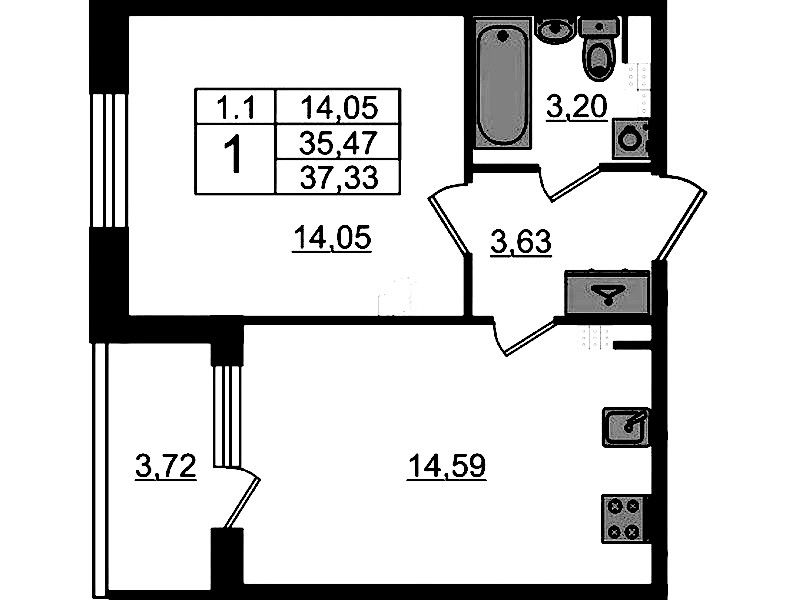 Однокомнатная квартира на 4-ом этаже 35,47 кв.м