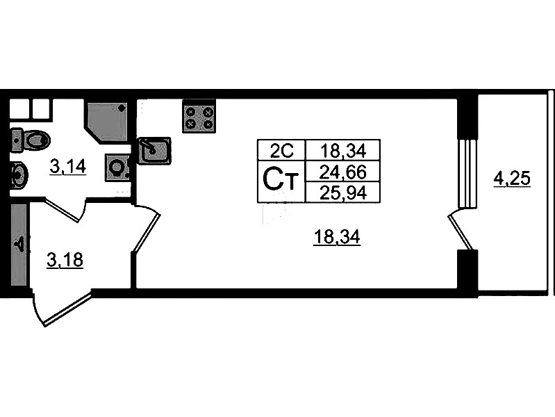 Квартира-студия на 2-ом этаже 24,66 кв.м