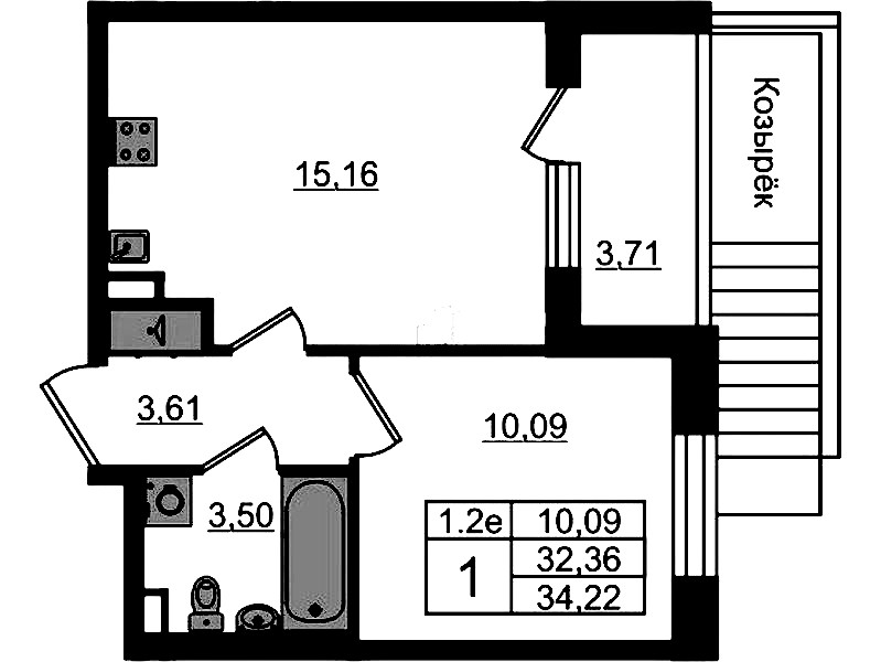 - Площадь кухни15,16 м2