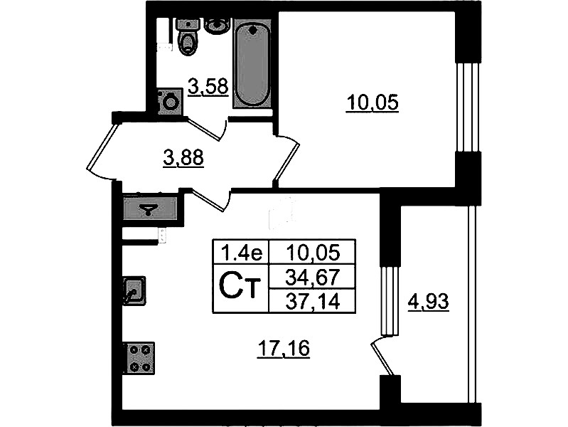 Однокомнатная квартира на 2-ом этаже 34,67 кв.м