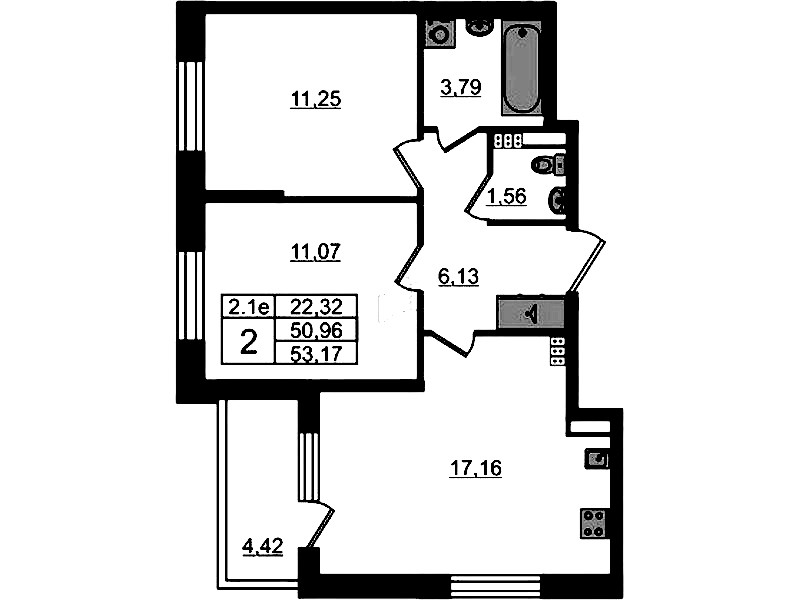 Двухкомнатная квартира на 4-ом этаже 50,96 кв.м