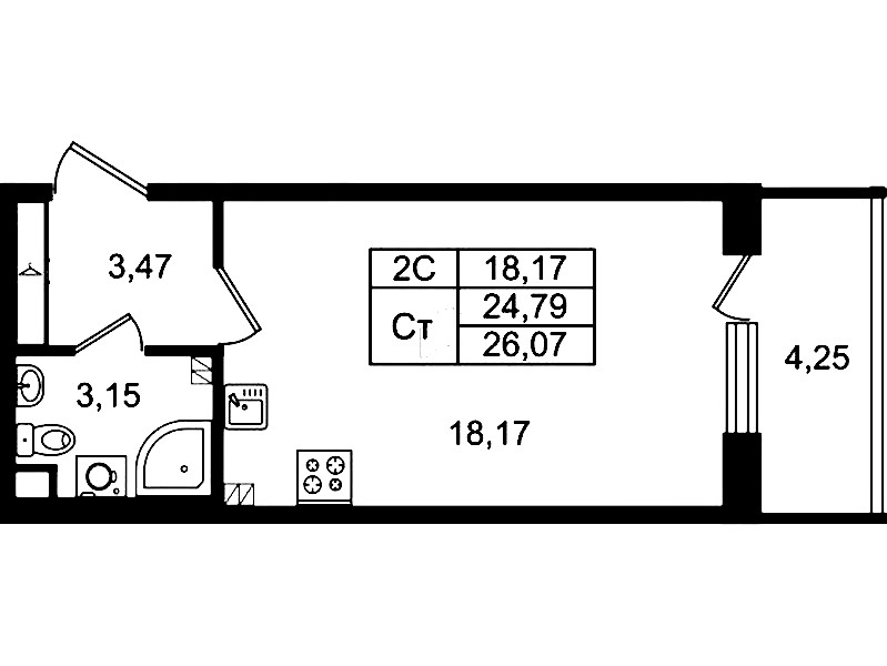 Квартира-студия на 3-ем этаже 24,79 кв.м