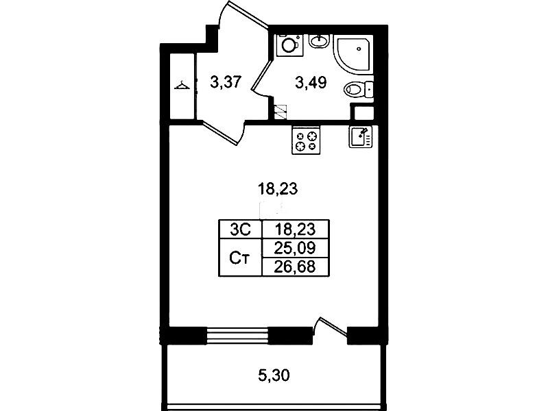 Квартира-студия на 3-ем этаже 25,09 кв.м