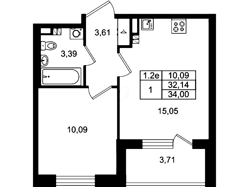Однокомнатная квартира на 4-ом этаже 32,14 кв.м