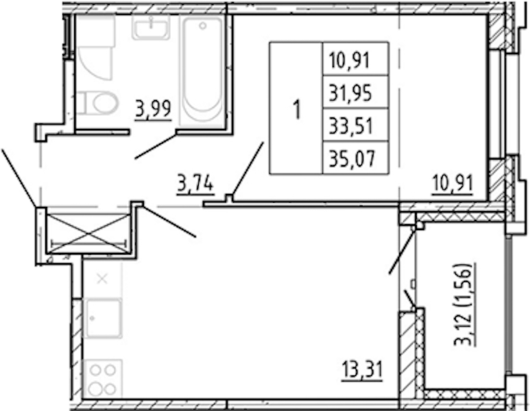 Однокомнатная квартира на 7-ом этаже 31,95 кв.м