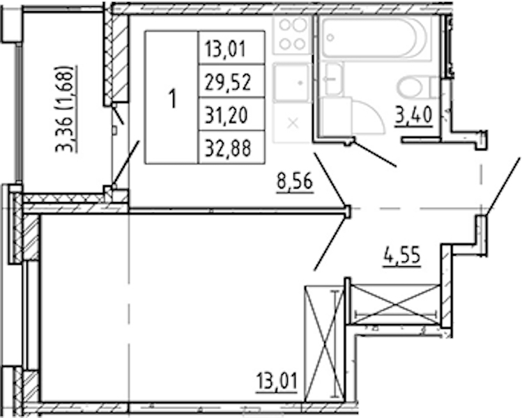 - Площадь кухни8,56 м2