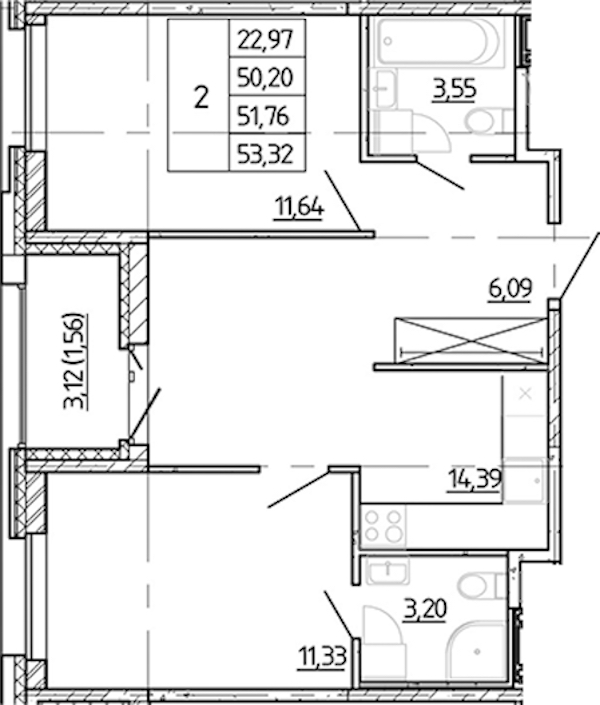 Двухкомнатная квартира на 12-ом этаже 50,2 кв.м