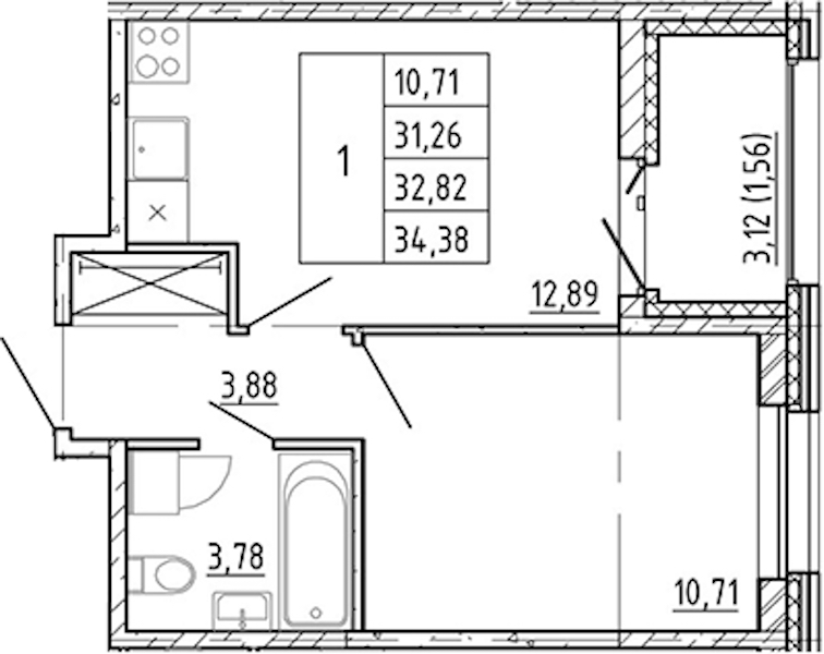 Однокомнатная квартира на 11-ом этаже 31,26 кв.м