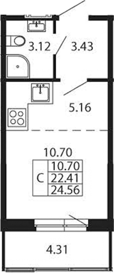 Квартира-студия на 3-ем этаже 22,41 кв.м