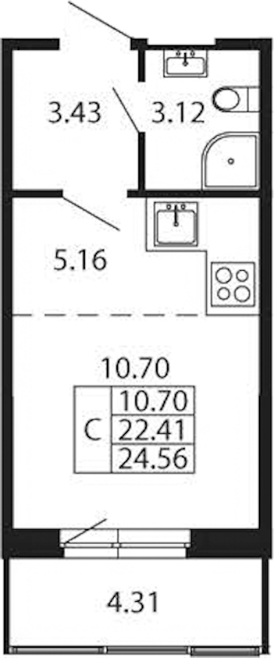 Квартира-студия на 6-ом этаже 22,41 кв.м