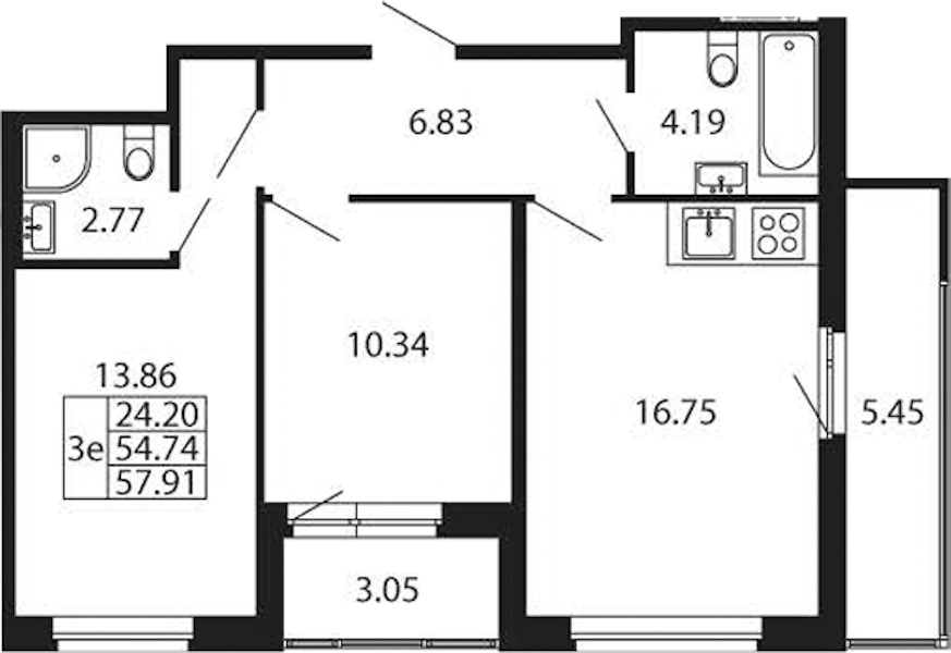 Двухкомнатная квартира на 3-ем этаже 54,74 кв.м