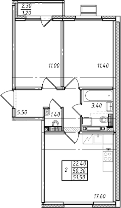 Двухкомнатная квартира на 3-ем этаже 51,5 кв.м