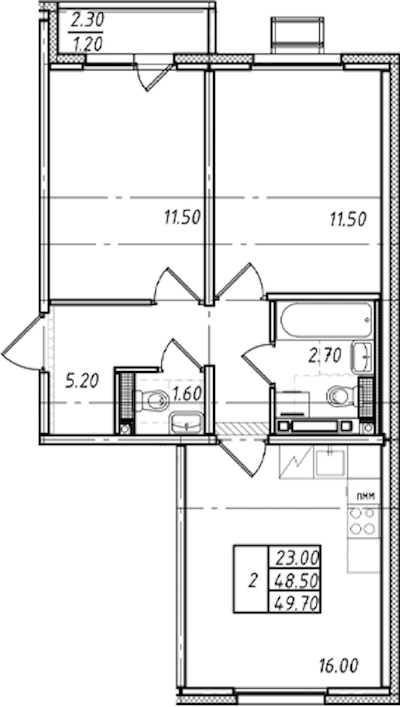 Двухкомнатная квартира на 11-ом этаже 49,7 кв.м