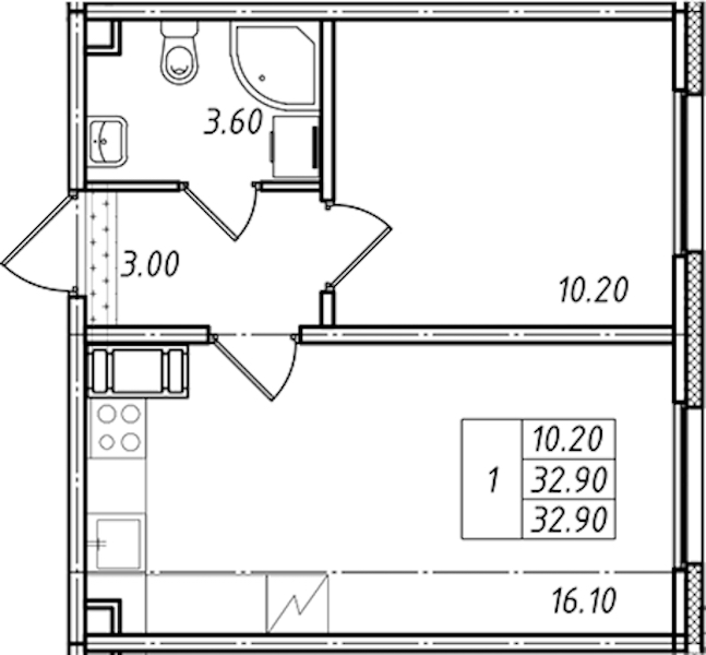 Однокомнатная квартира на 2-ом этаже 32,9 кв.м