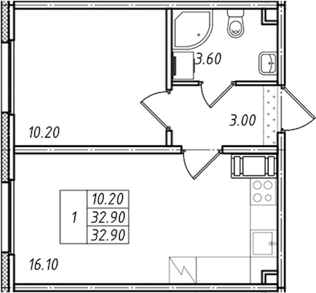Однокомнатная квартира на 11-ом этаже 32,9 кв.м