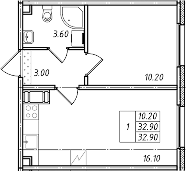 Однокомнатная квартира на 16-ом этаже 32,9 кв.м