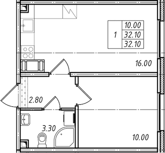 Однокомнатная квартира на 5-ом этаже 32,1 кв.м
