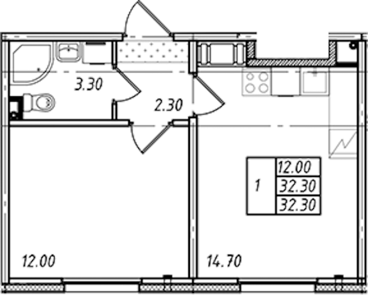 Однокомнатная квартира на 13-ом этаже 32,3 кв.м