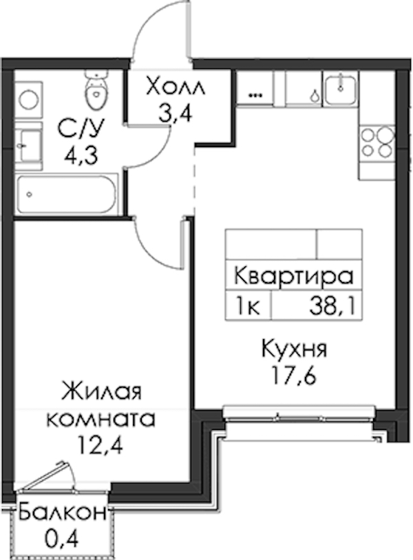 Однокомнатная квартира на 11-ом этаже 38,1 кв.м