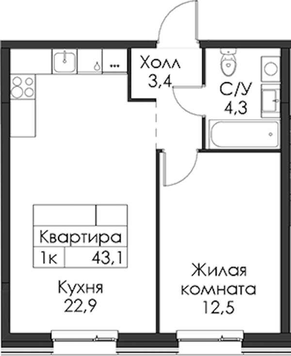 • Площадь43,1 м2