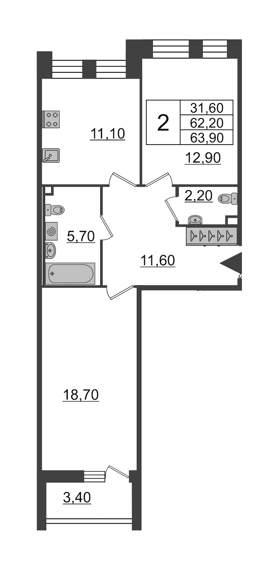Двухкомнатная квартира на 2-ом этаже 62,5 кв.м