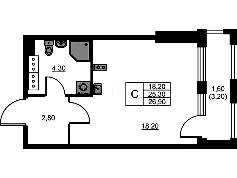 Квартира-студия на 4-ом этаже 26,9 кв.м