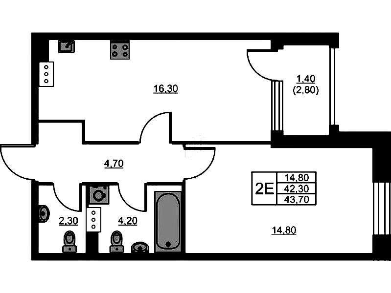 Однокомнатная квартира на 10-ом этаже 43,7 кв.м