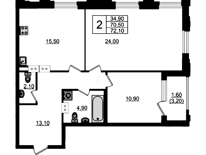 Двухкомнатная квартира на 12-ом этаже 72,1 кв.м