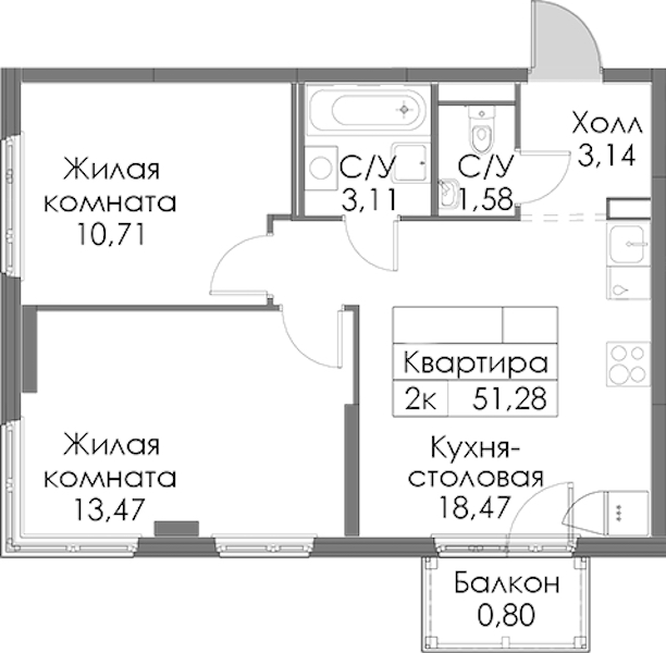 - Площадь51,28 м2