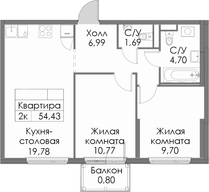 Двухкомнатная квартира на 9-ом этаже 54,43 кв.м