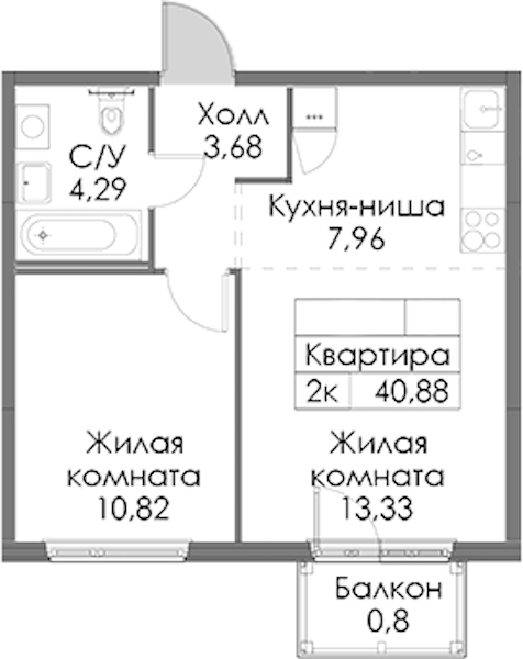 Однокомнатная квартира на 9-ом этаже 40,88 кв.м