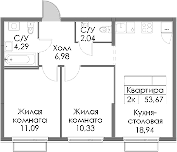 Двухкомнатная квартира на 4-ом этаже 53,67 кв.м