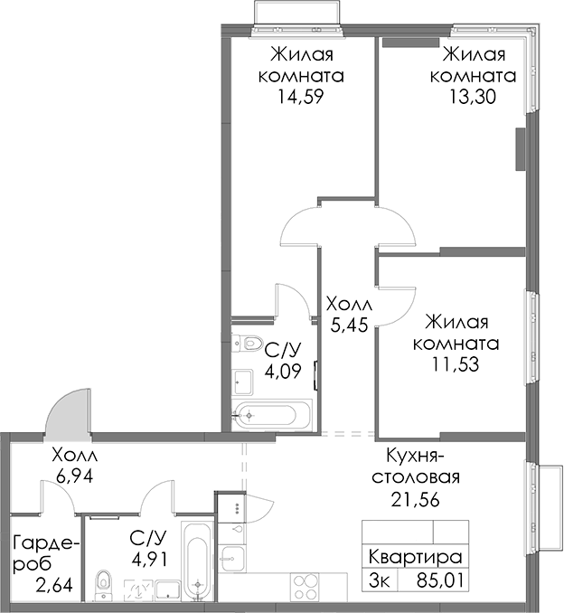 - Площадь85,01 м2
