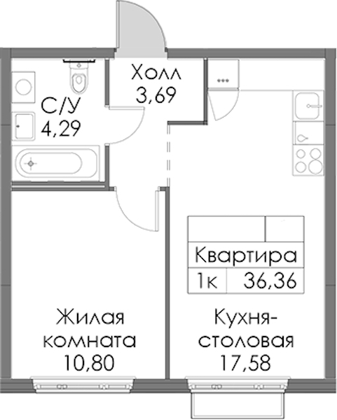 Однокомнатная квартира на 11-ом этаже 36,36 кв.м