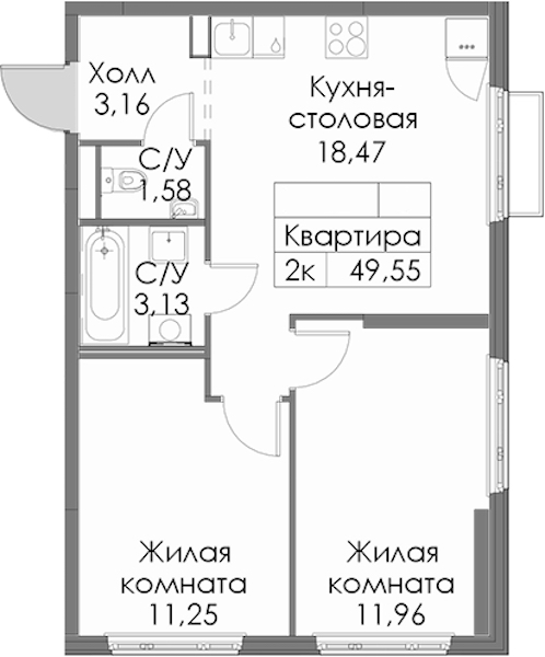 • Площадь49,55 м2