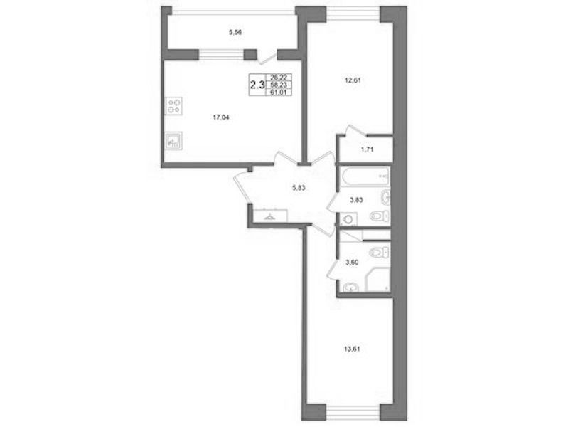 Двухкомнатная квартира на 7-ом этаже 58,23 кв.м