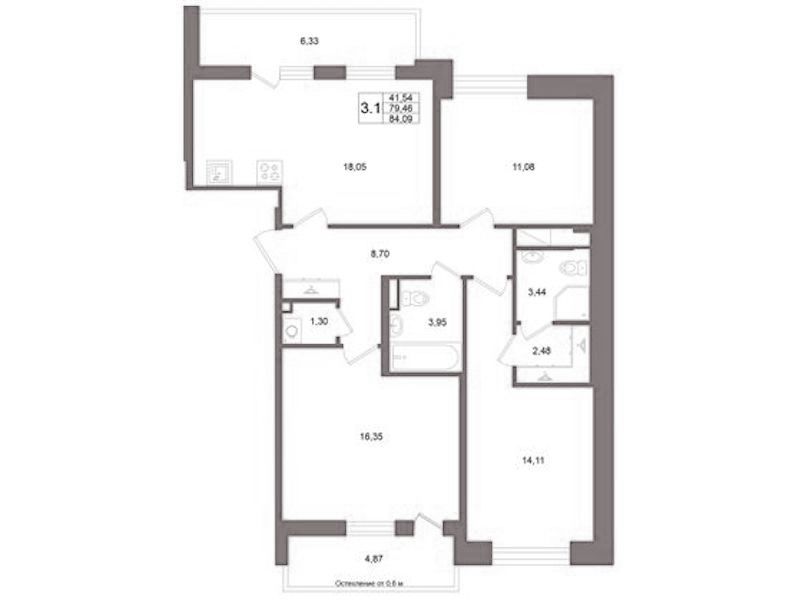 Трёхкомнатная квартира на 5-ом этаже 79,46 кв.м