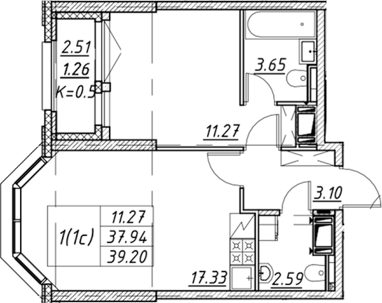 - Площадь39,2 м2