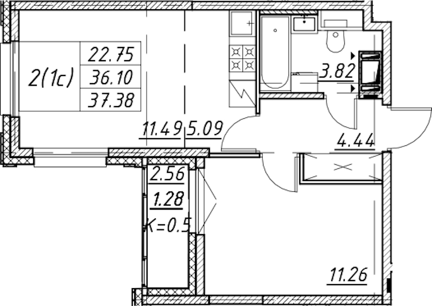 • Площадь37,38 м2