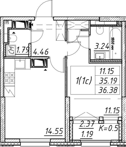 Однокомнатная квартира на 12-ом этаже 36,38 кв.м