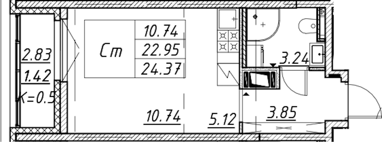 Квартира-студия на 6-ом этаже 24,37 кв.м